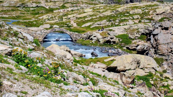 Pour la visite des lieux, passer aau refuge des Evettes , et les lacs des Pareis, puis, entre sentes cairnées et rochers baleines, descendre au Pont Romain et le franchir.